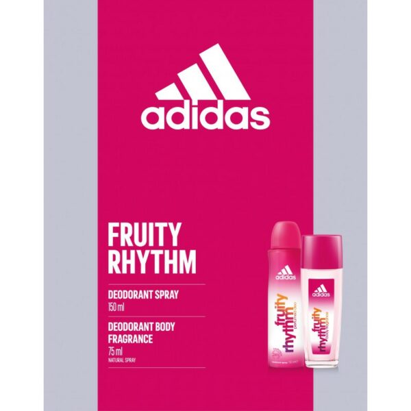 Adidas Fruity Rhythm Zestaw Dezodorant Atomizer 75ML + Antyperspirant Spray 150ML Damski zestaw prezentowy od Adidas w skład którego wchodzą topowe produkty z serii Fruity Rhythm. W skład tego kozackiego zestawu wchodzą następujące kosmetyki:Adidas Fruity Rhythm Dezodorant W Atomizerze 75ML - Energetyczy zapach Fruity Rhythm kryje w sobie zapał do życia i stworzony jest dla kobiet, które czerpią radość z każdego dnia. Kwiatowo-owocowy zapach tworzą soczyste czarne porzeczki, słodkie maliny, frezja i piżmo.Adidas Fruity Rhythm Antyperspirant Spray 150ML - Adidas Fruity Rhythm For Women to słodki, owocowo-kwiatowy dezodorant dla kobiet. Radosna i energiczna kompozycja, która pobudza do działania. Orzeźwia nie tylko ciało, ale również umysł.Nuty zapachowe:Nuta głowy: koktajl owocowy z malinami, czarną porzeczką i kiwiNuta serca: fiołek alpejski, frezja, hiacynt wodnyNuta głębi: bób tonka, tytoń, koktajl drzewny