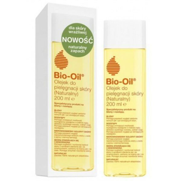 BIO OIL Naturalny Olejek Do Pielęgnacji Skóry BIO OIL Naturalny Olejek do pielęgnacji skóry został stworzony na podstawie naturalnej formuły 14 drogocennych, roślinnych olejków. Zostały one wybrane ze względu na ich profil sensoryczny, zdolność do szybkiego wchłaniania się przez skórę, a przede wszystkim skład kwasów tłuszczowych, które naturalnie występują w skórze i mają kluczowe znaczenie dla zdrowego funkcjonowania skóry.Olejek Bio Oil doskonale sprawdza się w przypadku redukcji blizn i rozstępów.Poprawia wygląd skóry, działa zarówno na świeże, jak i stare blizny.Regularnie stosowany zmniejsza ryzyko wystąpienia rozstępów, nawet tych ciążowych lub wynikających z wahania wagi czy szybkiego wzrostu.Ponadto poprawia ogólny wygląd skóry, wyrównuje jej koloryt, dodaje blasku i zdrowego wyglądu. Wygładza skórę z widocznymi śladami starzenia.Wspomaga prawidłowe nawilżenie skóry.W pełni naturalny skład - 100% naturalOlejek szybko się wchłaniaJest niekomedogennyPolecany do skóry wrażliwejSkładniki aktywne:Olejek z rozmarynu, nagietka, lawendy i tymianku – które działają regenerująco, kojąco i łagodząco.Witamina E – jest najczęściej stosowanym przeciwutleniaczem w pielęgnacji skóry, wspomaga utrzymanie zdrowego wyglądu skóry, chroni ją przed szkodliwym działaniem wolnych rodników, które powodują uszkodzenia skóry i są przyczyną przedwczesnego starzenia.PurCellin Oil™ – składnik który pozwolił na stworzenie produktu w postaci olejku o lekkiej i nietłustej konsystencji. Dzięki temu kosmetyk idealnie się wchłania, odżywia i nawilża skórę, dodatkowo olejek zmiękcza skórę, staje się ona miękka, gładka i lepiej wygląda.Naturalny Olejek Bio Oil to skuteczność potwierdzona badaniami klinicznymi.Pojemność: 200ML