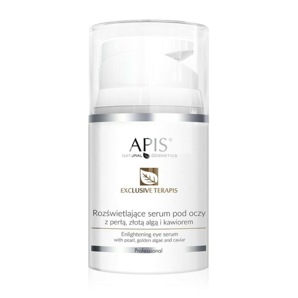 Apis Exclusive terApis Serum algowe pod oczy 50ml:Rozświetlające serum pod oczy z perłą, złotą algą i kawiorem jest preparatem o bezzapachowej i lekkiej konsystencji. Stymuluje produkcję kolagenu i elastyny dzięki czemu zmarszczki okolicy oczu stają się mniej widoczne. Dogłębnie nawilża pozostawiając skórę wygładzoną oraz rozświetloną. Wykazuje intensywne właściwości przeciwstarzeniowe, stymuluje wytwarzanie kolagenu, głęboko regeneruje i odżywia skórę.Składniki aktywne:ekstrakt z pereł morskich - działa przeciwstarzeniowo i antyoksydacyjnieekstrakt ze złotej algi - działa odżywczo i opóźnia procesy starzeniaekstrakt z kawioru – przywraca witalność skórykolagen – odżywia skórę i stymuluje do regeneracjimasło shea - odżywia, nawilża i wygładza skóręolej arganowy - regeneruje, nawilża, redukuje zmarszczkiPolecane dla skóry okolic oczu z potrzebą ujędrnienia i rozświetlenia. Jeśli zauważyłeś zmarszczki mimiczne wokół oczu. Sposób użycia: Na oczyszczoną skórę nałóż serum pod oczy. Produkt możesz stosować na dolną i górną powiekę. Stosuj go 1-2 razy dziennie.