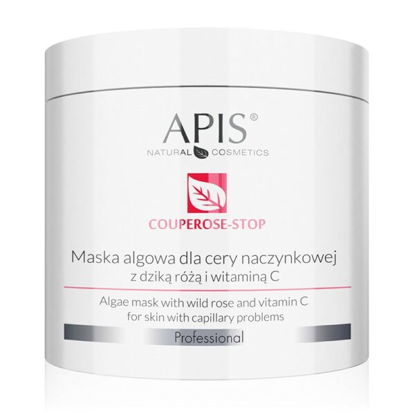 Apis Couperose-stop Maska algowa 200g:Maska algowa dla cery naczynkowej z dziką różą i witaminą C wzmacnia i uszczelnia ścianki naczynek krwionośnych chroniąc je przed rozszerzaniem. Preparat doskonale łączy problem naczynkowy z intensywnym nawilżaniem i odżywieniem skóry.Składniki aktywne: witamina C – wzmacnia ścianki naczynek krwionośnych, neutralizuje wolne rodniki i wyrównuje koloryt skóryekstrakt z dzikiej róży – nawilża, odżywia i regeneruje komórki skóryekstrakt z arniki - zmniejsza zaczerwienienia, poprawia koloryt skóryPolecana do cery wrażliwej, jeśli masz rozszerzone naczynia krwionośne bądź często występuje rumień. Sposób użycia: Do 15-20 g maski algowej dodaj około 40ml wody mineralnej niegazowanej (miarka w opakowaniu). Przez kilkadziesiąt sekund energicznie mieszaj – konsystencja nie może być ani za gęsta ani za płynna nałóż ją szpatułką na oczyszczoną skórę twarzy, szyi i dekoltu. Poczekaj 15-20 minut, ściągnij ją w całości. Jeżeli zostaną pozostałości maski na skórze to usuń je wodą lub tonikiem.