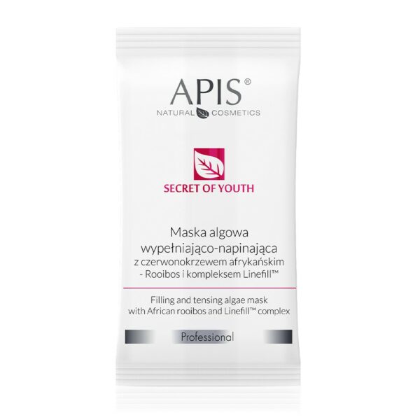 Apis Sekret młodości Maska algowa 20g:Maska algowa wypełniająco- napinająca z Czerwonokrzewem Afrykańskim Rooibos i kompleksem Linefill to maska zwierająca unikalną kombinację Kompleksu Linefill zwiększającego syntezę i akumulację lipidową. Wzbogacona o algę brunatną stymuluje produkcję kolagenu i elastyny, poprawia mikrokrążenie. Maska zawiera długotrwale nawilżający kwas hialuronowy, rewitalizujący ekstrakt z orchidei, antyoksydant opóźniający proces starzenia skwalan z opiwek.Preparat doskonale nawilża, wygładza zmarszczki, nadaje skórze aksamitną gładkość i blask.Składniki aktywne:kompleks Linefill - redukuje zmarszczki i wygładza skóręekstrakt z orchidei – działa rewitalizująco i odmładzającokwas hialuronowy – nawilżaskwalan z oliwek – regeneruje, głęboko nawilżaPolecana do cery ze zmarszczkami, wiotkiej bądź słabo napiętej. Jeśli idziesz na imprezę i potrzebujesz efektu WOW !Sposób użycia: Do 20 gram maski algowej dodaj około 40ml wody mineralnej niegazowanej . Przez kilkadziesiąt sekund energicznie mieszaj – maska nie może być ani za gęsta ani za płynna. Powinna mieć konsystencję „gęstej śmietany” Nałóż ją szpatułką na oczyszczoną skórę twarzy, szyi i dekoltu. Poczekaj 15-20 minut i ściągnij ją w całości. Jeżeli zostaną jakieś pozostałości maski na skórze to usuń je wodą lub tonikiem.