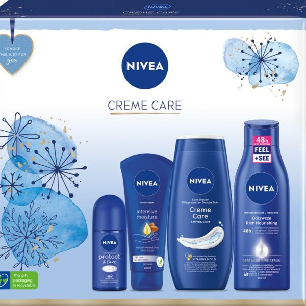 Nivea Creme Care Zestaw Kosmetyków Do Pielęgnacji Ciała Szukasz pomysłu na prezent na Święta? Podaruj bliskiej osobie zestaw do pielęgnacji ciała Nivea Creme Care! Zestaw zawiera aż 4 produkty do kompleksowej pielęgnacji ciała: żel pod prysznic, krem do rąk, antyperspirant oraz mleczko do ciała. Pielęgnujące formuły dostarczą skórze wyjątkowej ochrony i troski. To idealny świąteczny zestaw kosmetyków dla kobiety w każdym wieku. Postaw na prezent i pielęgnację w jednym od NIVEA. Tolerancja dla skóry potwierdzona dermatologicznie.Nivea Odżywcze Mleczko Do Ciała 250ML - Odżywcze mleczko do ciała wzbogacone jest o głęboko nawilżające serum, naturalny olejek migdałowy oraz witaminą E. Formuła kosmetyku intensywnie odżywia skórę przez 48h i odczuwalnie redukuje jej szorstkość - nawet w przypadku suchej skóry. Głęboko nawilżające serum zawarte w mleczku do ciała zapewnia intensywne nawilżenie oraz sprawia, że skóra staje się gładsza w dotyku. Sucha skóra staje się intensywnie nawilżona i zauważalnie gładsza przez 48h! Mleczko do ciała NIVEA zachowuje równowagę mikrobiomu skóry - to połączenie delikatnej pielęgnacji i intensywnego odżywienia.Nivea Creme Care Żel Pod Prysznic 250ML - Żel o kremowej konsystencji i unikalnym zapachu kremu NIVEA, który pozostawia skórę gładką i przyjemnie miękką w dotyku. Kremowy żel pod prysznic tworzy delikatną pianę, która nie tylko oczyszcza ciało i zapewnia wspaniały, dyskretny zapach, ale również pozostawia uczucie nawilżonej skóry. Formuła żelu dba o skórę podczas kąpieli, zachowują równowagę jej mikrobiomu. Kosmetyk zawiera prowitaminę B5. Tolerancja dla skóry potwierdzona dermatologicznie.Nivea Intensive Moisture Krem Do Rąk 100ML - Jego formuła z naturalnym olejkiem migdałowym, masłem shea i typowym zapachem NIVEA zapewnia bogatą pielęgnację i intensywne odżywienie i nawilżenie, które utrzymuje się przez 24 godziny. Wzbogaciliśmy wszystkie formuły kremów do rąk NIVEA o pielęgnujące olejki, dzięki czemu dłonie będą gładkie i chronione przez cały dzień.Nivea Protect & Care Antyperspirant Roll-On 50ML - Zawiera składniki oraz zapach Kremu NIVEA, łagodnie pielęgnuje skórę pod pachami, a jednocześnie zapewnia wysoce efektywną ochronę przed poceniem. To idealne połączenie skuteczności i pielęgnacji sprawia, że możesz czuć się pewnie przez cały dzień. Antyperspirant będzie zapobiegać nadmiernemu poceniu się nawet przez 48 godzin, zapewniając Ci dyskretny zapach. Produkt nie zawiera alkoholu.