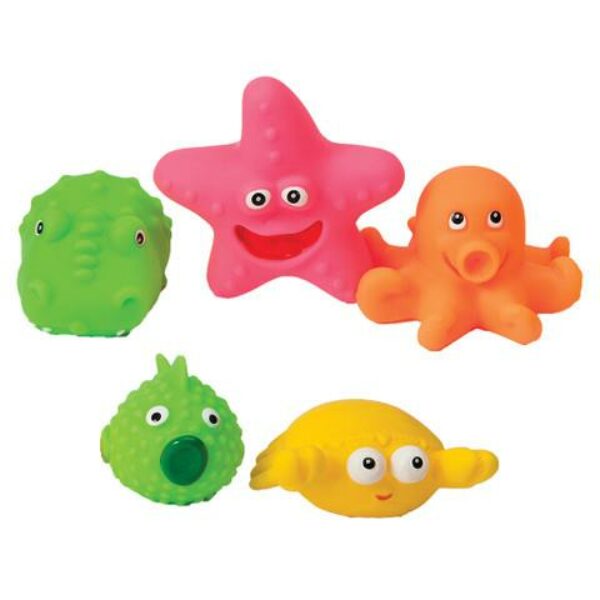 Zabawki- piszczki do kąpieli Zwierzaki morskie sprawią, że Twoje dziecko nie będzie chciało przestać się kąpać! Zestaw zabawek do kąpieli w kształcie morskich zwierzątek składa się z czterech wytrzymałych i wodoodpornych towarzyszy kąpieli. Każda zabawka ma inny kształt i intensywny kolor. Zabawki po ściśnięciu wydają z siebie delikatny dźwięk. Każda zabawka ma wypustki, które dodatkowo stymulują zmysł dotyku. Łatwo jest je złapać. Dzieci zachwycą się kąpielowymi zabawkami i na pewno nie będą chciały wyjść szybko z wody- na pewno nie bez swoich nowych, kolorowych przyjaciół. Zestaw zabawek do kąpieli Zwierzaki morskie rozwijają wyobraźnię i kreatywność oraz motorykę i pomysłowość. Liczba elementów: 4 Kolory zwierzątek w zestawie są wybierane losowo! Zabawki są ręcznie malowane. Wiek: od pierwszych dni życia maluszka Materiał: miękkie, bezpieczne PVC nie zawierające BPA i ftalanów Rozmiar opakowania: 17 x 22 cm Zgodny z normą EN-7. Posiada znak CE. Produkt polski.