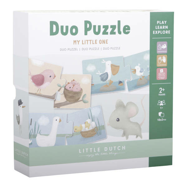 Puzzle dla najmłodszych od Little Dutch to pierwsze ulubione puzzle dla Twojego dziecka. Duo puzzle Flowers & Butterflies od Little Dutch to piękny zestaw puzzli, który jest pełen ilustracji zwierząt. Ze względu na stopień skomplikowania, puzzle są idealne już dla najmniejszych dzieci. Duo puzzle pozwalają na ułożenie 10 kombinacji dwuelementowych, dzięki czemu dziecko: uczy się rozwijać umiejętności motoryczne, rozwija cierpliwość, uczy się rozpoznawania kształtów, rozwiązuje pierwsze łamigłówki i ćwiczy pamięć. Każdy element jest wykonany z wytrzymałego kartonu który ma idealny kształt i rozmiar dostosowany do małych rączek. Puzzle zapakowane są w estetyczne pudełko, dzięki czemu są idealnym pomysłem na prezent. Zgodność z normą: EN-71-1-2-3 Wiek: rekomendowany 2 lata+