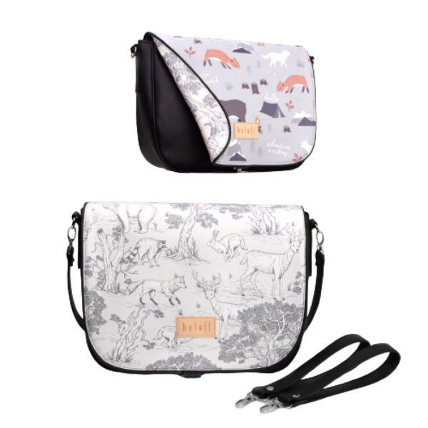 Piękna dwustronna torba do wózka od Beloff North Wild Into the Wild jest niezbędna dla każdej mamy. Pojemna torba Madeline jest nieodzownym elementem miejskiej wyprawy na spacer czy w podróż z dzieckiem. Pomieści wszystko co jest potrzebne maluszkowi i mamie. Torba dwustronna do wózka Beloff jest niesamowicie praktyczna: posiada organizer w środku, jest wodoodporna na zewnątrz i w środku, klapa torby jest dwustronna, posiada 2 różne wzory z możliwością przepinania, w komplecie znajdują się krótkie paski do mocowania do wózka, w komplecie jest również długi regulowany pasek na ramię, wykonana jest z niekruszącej się eko skóry. Materiał: eko skóra, podszewka poliester 100% Rozmiar: 35cm szerokość, 24cm wysokość, głębokość 9-6cm. Zalecenia prania: czyścimy wilgotną szmatką, nie pierzemy w pralce.