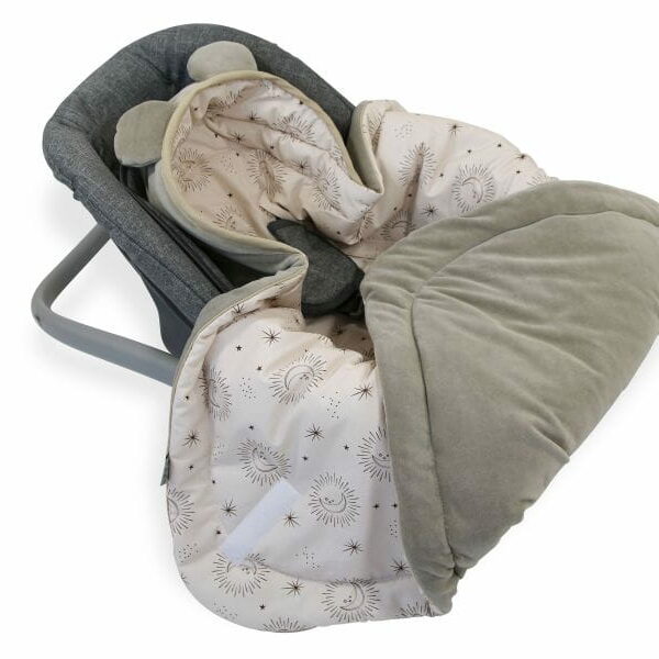 Otulacz do fotelika zapewni przyjemne otulenie Twojemu maluszkowi Używając otulacza do okrycia dziecka nie ma potrzeby ubierania malucha w ciepłe kurtki i kombinezony. Oszczędzamy w ten sposób i zmniejszamy flustrację dziecka. Dziecko spokojne będzie chętniej podróżowało. Używając otulacza do fotelika zwiększamy bezpieczeństwo podróży. Pasy dokładnie przylegają do dziecka. Pasy zapięte na śliską kurtkę podczas niebezpiecznego zdarzenia mogą się zsunąć. Otulacz samochodowy znany również jako kocyk do nosidełka. Jest on niezwykle komfortowy w użytkowaniu - wystarczy włożyć dziecko do fotelika, w którym jest zamontowany otulacz i przykryć. Podczas podróży można w szybki sposób dziecko odkryć. Dlaczego warto wybrać otulacz do fotelika Tiny Star? Otulacz Tiny Star jest miękki,i przyjemny w dotyku uszyty z oddychających tkanin 100% bawełny oraz bawełnianego weluru wypełniony antyalergiczną włókniną, która zapewnia maluszkowi ciepło otulacz do nosidełka posiada kapturek z uroczymi uszami jest zapinany na rzep dzięki temu można regulować zakres uniwersalne otwory na plecach sprawiają, że otulacz samochodowy pasuje do każdego fotelika z 3- i 5- punktowymi (również nierozdzielnymi) pasami bezpieczeństwa nowoczesny wzór Moon Sandy Otulacz do fotelika - do jakiego wieku? Otulacze do fotelika dedykowane są maluchom od 0 do około 12 miesięcy (do rozmiaru 80/86). Orientacyjny czas użytkowania to 2 sezony. Trwałość produkt zdecydowanie pozwoli na korzystanie z niego przez kolejne dzieci. Otulacz zakupiony wiosną posłuży także w okresie jesienno-zimowym, zakupiony jesienią wystarczy do lata. Wkładkę dla noworodka należy montować na otulacz. Uwagi: do prania weluru nie używać płynów zmiękczających, gdyż mogą sklejać włosie. Pranie w 30 stopniach, wirowanie 800 ob/min. Wymiary: kwadrat o boku ok. 91 cm Skład: tkaniny 100% bawełna, welur 80% bawełna + 20% poliester, wypełnienie 100% poliester Zastosowane tkaniny i wypełnienia posiadają certyfikat "Oeko-Tex Standard 100". Produkt uszyty w Polsce.