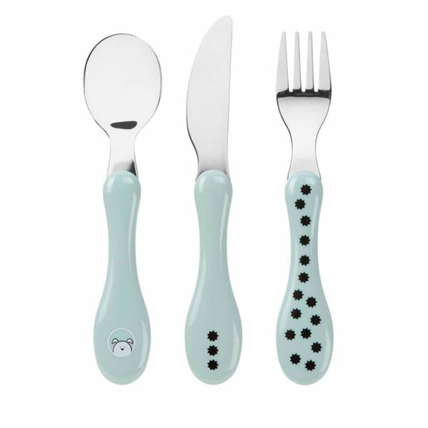 Zestaw sztućców ze stali nierdzewnej z serii little Chums wzór Pies od Lassig doskonale sprawdzi się podczas nauki samodzielnego jedzenia, są bezpieczne dla dziecka, a zarazem solidne. na zestaw sztućców składają się z widelec, łyżka i nóż idelane dla małego dziecka ponieważ są lekkie mają specjalnie profilowane kształty co ułatwia dzieciom nabieranie pożywienia mają zaokrąglone kształy, które są w pełni bezpieczne dla ust i delikatnych dziąseł maluchów rękojeść jest z przyjemnego tworzywa, ma przewężenie dzięki temu dziecko łatwo je chwyci i utrzyma w małej rączce kolor rączek pastelowy miętowy, ozdobiony w czarne gwiazdki na widelcu i nożu oraz miłej mordki pieska na łyżce można myć w zmywarce nie można stosować w kuchence mikrofalowej Wiek: 1+ Wymiary opakowania: 11 x 1,5 x 16,5 cm Waga: 70 g Skład: 100% stal nierdzewna, rękojeść: 100% tworzywo ABS