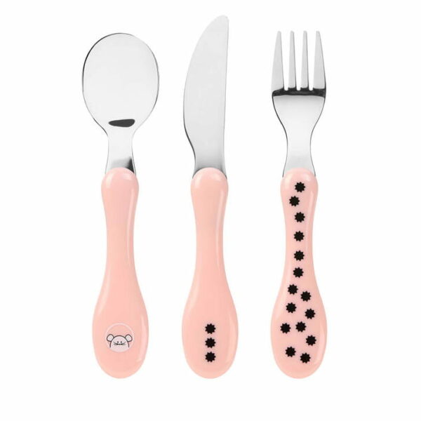 Zestaw sztućców ze stali nierdzewnej z serii little Chums wzór Mysz od Lassig doskonale sprawdzi się podczas nauki samodzielnego jedzenia, są bezpieczne dla dziecka, a zarazem solidne. na zestaw sztućców składają się z widelec, łyżka i nóż idelane dla małego dziecka ponieważ są lekkie mają specjalnie profilowane kształty co ułatwia dzieciom nabieranie pożywienia mają zaokrąglone kształy, które są w pełni bezpieczne dla ust i delikatnych dziąseł maluchów rękojeść jest z przyjemnego tworzywa, ma przewężenie dzięki temu dziecko łatwo je chwyci i utrzyma w małej rączce kolor rączek pastelowy różowy, ozdobiony w czarne gwiazdki na widelcu i nożu oraz miłej mordki myszki na łyżce można myć w zmywarce nie można stosować w kuchence mikrofalowej Wiek: 1+ Wymiary opakowania: 11 x 1,5 x 16,5 cm Waga: 70 g Skład: 100% stal nierdzewna, rękojeść: 100% tworzywo ABS