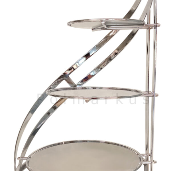 Stojak doskonale sprawdza się na torty weselne i inne wypieki, 3-elementowy w formie spirali. Wykonany ze stali chromowej. Konstrukcja i podstawa mocna oraz stabilna.Wymiary talerzy: 20, 26, 32 cm.