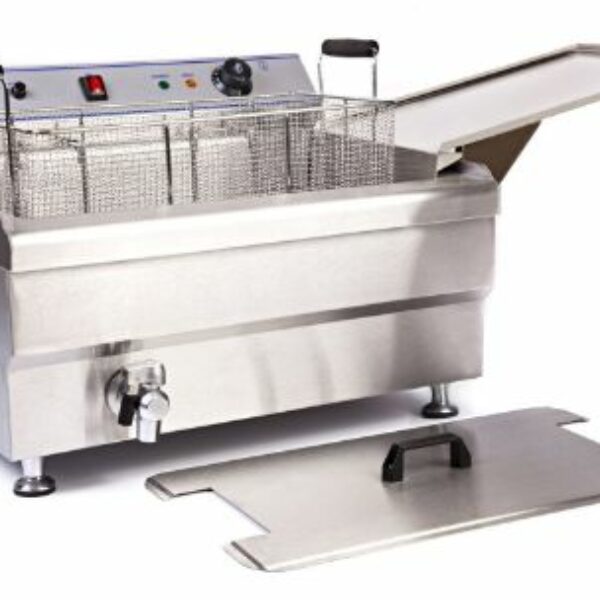 Smażalnik do pączków wykonany w 100% ze stali nierdzewnej. Posiada wysokiej jakości nowoczesny termostat, dzięki któremu urządzenie ma stałą temperaturę oraz jest zaopatrzone w funkcje automatycznego wyłączania energii, jeśli olej osiągnie za wysoką temperaturę. Dodatkową zaletą smażalnika jest dodatkowa półka boczna, kranik spustowy oleju i powierzchnia chłodzenia gwarantująca, że zawartość, która wypada z kosza, ląduje na dnie w zimnej strefie. Maszyna jest łatwa w obsłudze i czyszczeniu, szybko się nagrzewa, przyspieszając przygotowywanie produktów, przy minimalnym zużyciu energii.Napięcie: 380 VMoc: 9 kWKosz: 46 x 27 x 15 cmPółka: 46,5 x 29,5 x 8,5 cmPojemność całkowita: 30 litrówPojemność wlewcza: 24 litryWymiary: 60 x 52 x 37 cmWaga: 19,6 kg