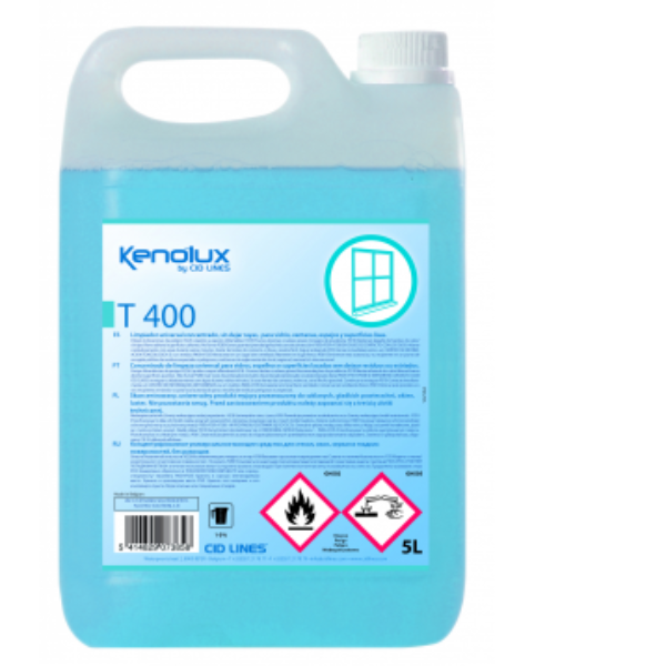 Środek Kenolux T 400 to skoncentrowany produkt myjący przeznaczony do mycia szkła, okien, luster oraz innych gładkich powierzchni.Właściwości preparatu Kenolux T 400:nie pozostawia smugniskopieniący produkt, zapewniający optymalną skuteczność myciaw przypadku niewielkich zabrudzeń może być stosowany w niskich stężeniach, aby utrzymać powierzchnie w czystościSposób użycia Kenolux T 400:Produkt dozować w stężeniu:1-2% (niski stopień zabrudzenia)3-5% (normalny poziom zabrudzenia)5-10% (wyjątkowo wysoki poziom zabrudzenia)Specyfikacja: Postać: niebieska ciecz, pH ok.7, Temperatura zapłonu: 50°C, Gęstość (20°C): 0,98 kg/LPrzechowywanie i usuwaniePostępowanie z odpadami produktu/odpadami opakowaniowymi po produkcie: odpady produktu oraz opakowania zanieczyszczone produktem oddawać wyłącznie do wyspecjalizowanych przedsiębiorstw zagospodarowania odpadów. Nie umieszczać odpadach komunalnych. Unikać zrzutów do środowiska. Postępowanie w przypadku niezamierzonego uwolnienia do środowiska: Nie dopuścić do przedostania się środka do kanalizacji i wód publicznych, a w razie zajścia takiego zdarzenia poinformować odpowiednie władze. Magazynowanie: przechowywać wyłącznie w oryginalnym opakowaniu w chłodnym, dobrze wentylowanym miejscu. Przechowywać pojemnik zamknięty kiedy produkt nie jest w użyciu. Nie magazynować w metalowych pojemnikach wykonanych z łatwo korodujących metali.Instrukcje bezpieczeństwa dla użytkownikaUnikać kontaktu pomiędzy alkalicznymi i kwaśnymi produktami. Zawsze, przed pierwszym zastosowaniem produktu, należy przeprowadzić test na małej powierzchni. Należy skontaktować się ze specjalistą CID LINES w celu dobrania odpowiedniego programu mycia i dezynfekcji, który jest dostosowany do rodzaju zabrudzenia oraz specyficznych warunków zakładu. Przed zastosowaniem należy zapoznać się z treścią Karty Charakterystyki produktu.Producent: CID LINES NV, Waterpoortstraat, 2, B-8900 Ieper Belgia, Tel + 32 57 21 78 77, Faks + 32 57 21 78 79, info@cidlines.com