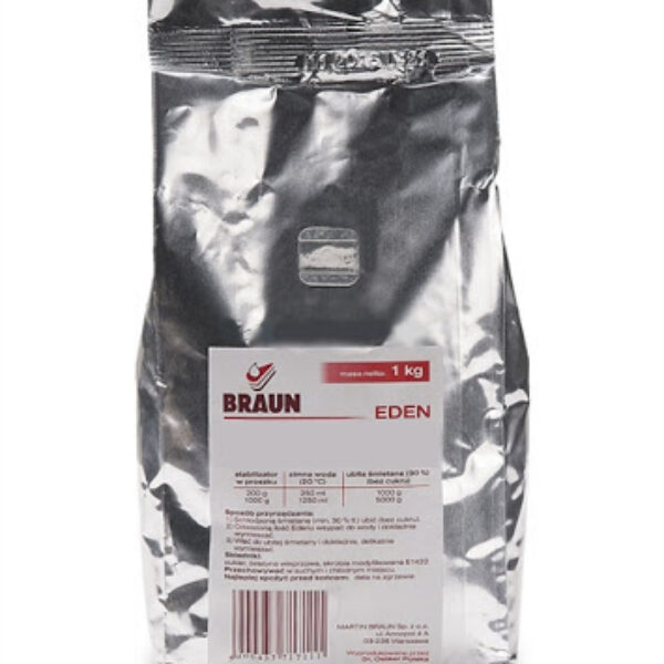 Stabilizatory Eden to produkty idealne do stabilizowania śmietanki oraz wykorzystania do ciast deserowych i tortów. Zapewniają trwałość i właściwą konsystencję gotowemu wyrobowi. Zawartość naturalnych owoców w stabilizatorach o owocowych smakach nadaje ciastom, tortom, roladom i innym wypiekom cukierniczym niepowtarzalny smak i wygląd.Receptura podstawowa:Stabilizator Eden – 0,2 kgWoda – 0,25 kgŚmietanka 30% – 1,0 kgStabilizator rozpuścić w wodzie, a następnie ubić ze śmietanką.Uwaga! Stabilizatory Eden szybciej wiążą śmietankę niż stabilizator Alaska, czyli po przygotowaniu należy w miarę szybko zużywać do przekładania ciasta.