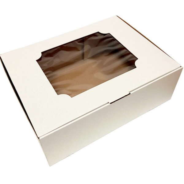 Pudełko na tort o konstrukcji tektury mikrofali, która wyróżnia się dużą sztywnością i doskonałą odpornością na zgniatanie, posiada okienko doskonale eksponujące zapakowane wyroby cukiernicze.Opakowanie chroni wypieki przed zniszczeniem, ułatwia transport, a rozkładany bok umożliwia łatwe zapakowanie produktu. Mikrofala – tektura 3-warstwowa o wysokości fali 1,1 -1,7 mm. Gramatura 390 g/m kw.Opakowanie zostało wykonane w całości z jednego arkusza papieru.