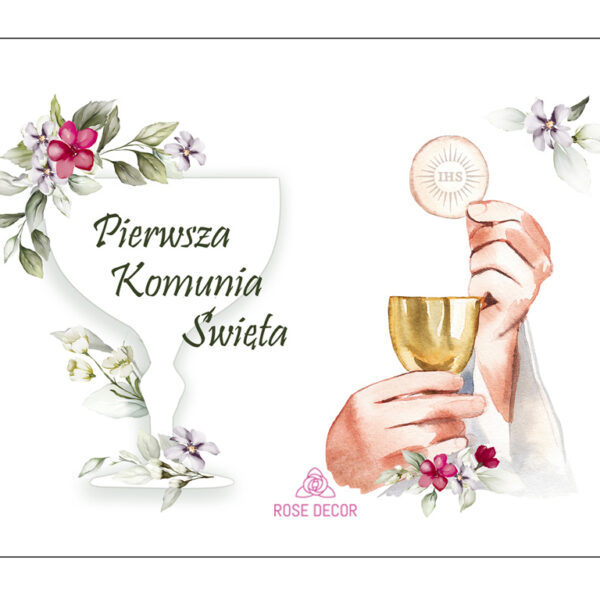 Opłatek na tort komunijny kielich w biało-różowych kwiatach A4 720481