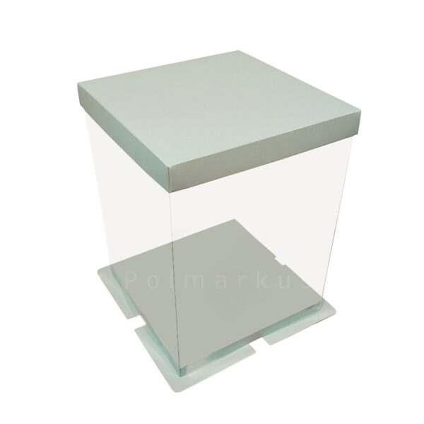 Eleganckie, wysokie, błękitne pudełko na tort wykonane z plastiku i kartonu. Pudełko składa się z podstawy, która została wykonana ze styroduru pokrytego laminatem o grubości 2 cm, przezroczystej plastikowej osłony, oraz kartonowej pokrywki.Dzięki specjalnym wycięciom na cieńszej warstwie podstawy, całość można ozdobić dowolną wstążką.Pudełko idealne do transportu tortów ślubnych lub tortów z dekoracjami na topie - zawartość widoczna nawet podczas transportu.Wymiary wnętrza pudełka:podstawa: 30x30 cm, wysokość: 40 cm (wraz z podstawą 1cm), sugerowana wysokość użytkowa max: 37cm.Wymiary zewnętrzne pudełka:podstawa 35x35 cmPudełka dostępne są w kolorze czarnym, błękitnym, różowym, złotym i perłowym oraz w wysokościach 25 i 40 cm.Kliknij tutaj i zobacz wszystkie warianty.