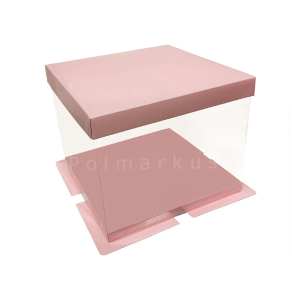 Eleganckie, wysokie, różowe pudełko na tort wykonane z plastiku i kartonu. Pudełko składa się z podstawy, która została wykonana ze styroduru pokrytego laminatem o grubości 2 cm, przezroczystej plastikowej osłony, oraz kartonowej pokrywki.Dzięki specjalnym wycięciom na cieńszej warstwie podstawy, całość można ozdobić dowolną wstążką.Pudełko idealne do transportu tortów ślubnych lub tortów z dekoracjami na topie - zawartość widoczna nawet podczas transportu.Wymiary wnętrza pudełka:podstawa: 30x30 cm, wysokość: 25 cm (wraz z podstawą 1cm), sugerowana wysokość użytkowa max: 22cm.Wymiary zewnętrzne pudełka:podstawa 35x35 cmPudełka dostępne są w kolorze czarnym, błękitnym, różowym, złotym i perłowym oraz w wysokościach 25 i 40 cm.Kliknij tutaj i zobacz wszystkie warianty.