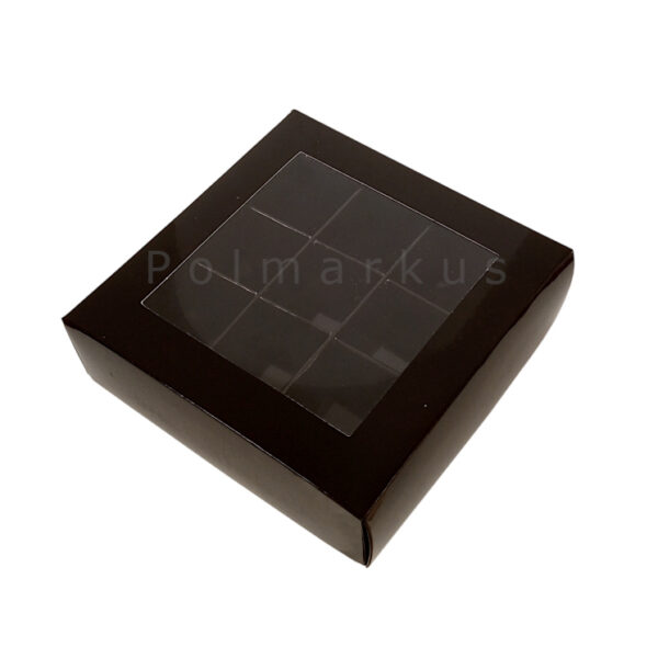 Eleganckie, a zarazem praktyczne i funkcjonalne pudełko z przykrywką wykonane z wysokiej jakości kartonu. Przykrywka posiada okienko, doskonale eksponujące zapakowane wyroby cukiernicze. Świetnie sprawdzi się jako opakowanie na 9 sztuk trufli, pralin oraz czekoladek.Rozmiar jednego miejsca na pralinę maksymalnie 3,5x3,5 cm.