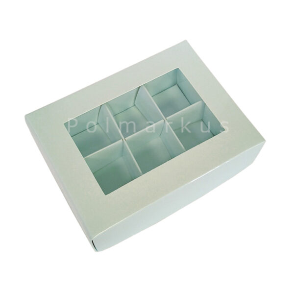 Eleganckie, a zarazem praktyczne i funkcjonalne pudełko z przykrywką wykonane z wysokiej jakości kartonu. Przykrywka posiada okienko, doskonale eksponujące zapakowane wyroby cukiernicze. Świetnie sprawdzi się jako opakowanie na 6 sztuk trufli, pralin lub czekoladek.Rozmiar jednego miejsca na pralinę maksymalnie 3,5x3,5 cm.