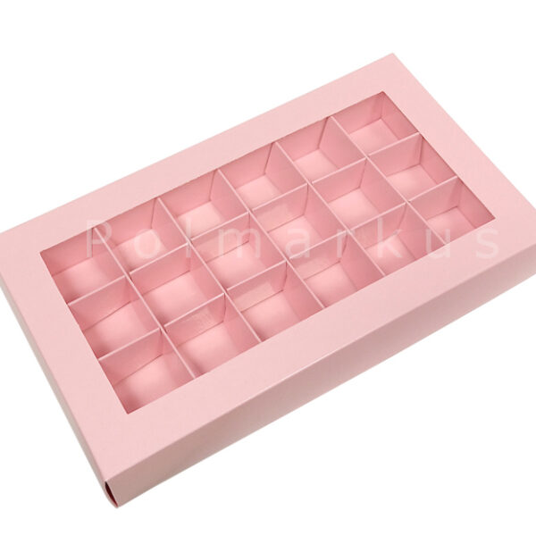 Eleganckie i praktyczne pudełko w kolorze różowym pastelowym z przykrywką wykonane z wysokiej jakości kartonu. Przykrywka posiada okienko, doskonale eksponujące zapakowane wyroby cukiernicze. Świetnie sprawdzi się jako opakowanie na 18 sztuk trufli, pralin lub czekoladek.Rozmiar jednego miejsca na pralinę maksymalnie 3,5x3,5 cm.