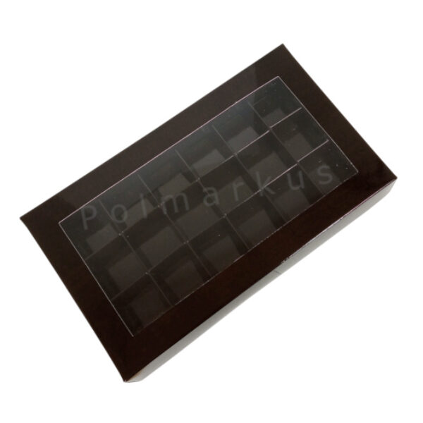Eleganckie i praktyczne pudełko w kolorze czarnym pastelowym z przykrywką wykonane z wysokiej jakości kartonu. Przykrywka posiada okienko, doskonale eksponujące zapakowane wyroby cukiernicze. Świetnie sprawdzi się jako opakowanie na 18 sztuk trufli, pralin lub czekoladek.Rozmiar jednego miejsca na pralinę maksymalnie 3,5x3,5 cm.