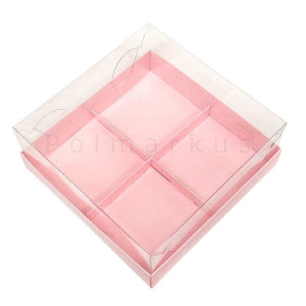 Eleganckie pudełko w kolorze różowym posiadające przezroczyste wieczko eksponujące zawartość. Świetnie sprawdzi się na 4 szt. monoporcji, muffinek lub babeczek.Pudełko z wyjmowaną wkładką, oddzielającą i zabezpieczającą przed przemieszczaniem się zawartości.Rozmiar jednego miejsca na monoporcje max 8,5x8,5 cmOpakowania dostępne są w różnych kolorach i rozmiarach - zobacz wszystkie.