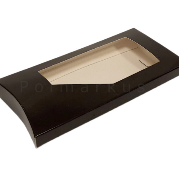 Pudełko na tabliczkę czekolady z okienkiem w kolorze czarnym o wymiarach 16,5 x 8,5 x 1,5 cm.Okienko bez podklejonej folii - folię do pakowania tabliczki czekolady należy dokupić osobno (art. 42671).