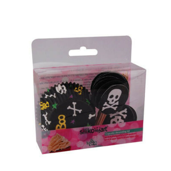 Zestaw włoskiego producenta Silikomart składający się z 24 papierowych papilotek o średnicy dołu 5 cm i wysokości 3 cm oraz 24 toperów do wbicia w babeczki i muffinki. Wszystkie elementy ozdobione są czaszkami, dzięki temu świetnie sprawdzą się do przyozdabiania słodkości z okazji Halloween.Numer produktu Silikomart: 70.171.01.0063