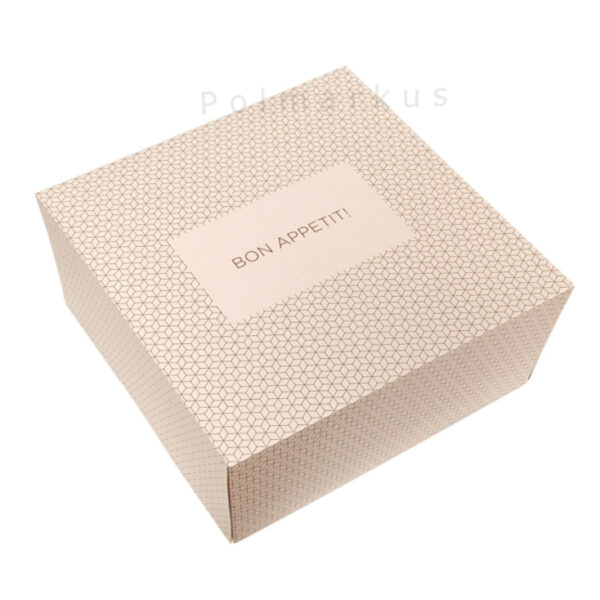 Pudełko na ciasto wykonane z wysokiej jakości tektury z eleganckim wzorem i nadrukiem "Bon Appetit!"Opakowanie jest jednoczęściowe, środek w kolorze jasno brązowym. Idealne rozwiązanie do sprzedaży ciast na wynos w Twojej cukierni, kawiarni lub innym punkcie.Pudełka dostępne są w różnych rozmiarach - kliknij tutaj i zobacz wszystkie.Kolory opakowań na zdjęciach mogą nieznacznie różnić się od rzeczywistych w zależności od ustawień monitora i karty graficznej.