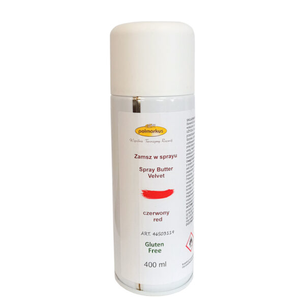 Zamsz spożywczy w kolorze czerwonym pozwalający na uzyskanie kolorowej powłoki zamszowej na zmrożonej lub schłodzonej powierzchni wyrobów cukierniczych typu ciast, tortów oraz figurek czy dekoracji wykonanych na bazie czekolady, marcepanu lub lukru. Produkt bezglutenowy.Skład: masło kakaowe, barwniki: E129, E120, gaz nośny E943a, E943b, E944. Produkt może zawierać MLEKO, siarczyny, SOJĘ i ORZECHY.Instrukcja użycia:Przed użyciem dobrze wstrząsnąć, upewnić się, że produkt jest płynny (pojemnik musi mieć temp. niższą niż 25 °C i nie wyższą niż 35 °C). Podgrzać pojemnik do temp. maksymalnie 35 °C w ciepłej wodzie w celu rozpuszczenia masła kakaowego - produkt gotowy do zastosowania. Spryskać chłodną powierzchnię produktu jednolitą warstwą z odległości 20-25 cm. Po użyciu odwrócić puszkę do góry dnem i spryskać przez kilka sekund w celu oczyszczenia dozownika. Wyczyść końcówkę dozownika gorącą wodą po użyciu produktu. Udekorowany produkt zostawić na minimum godzinę przed spożyciem.