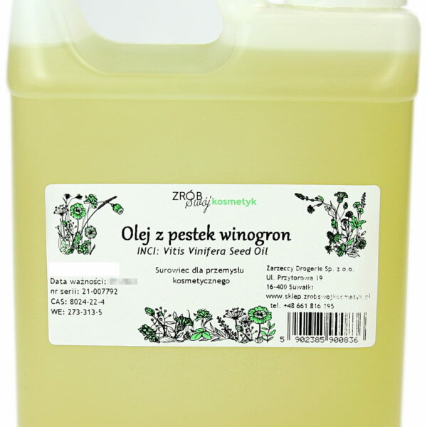 Olej z Pestek Winogron działa odżywczo, regenerująco, antyoksydacyjnie INCI Vitis Vinifera Seed Oil Olej z pestek winogron bogaty NNKT kwasy tłuszczowe m.in kwas linolowy (LA) i kwas α-linolowy (ALA). Dzięki wysokiej zawartości kwasów uelastycznia skórę, a włosy czyni bardziej błyszczącymi i zdrowiej wyglądającymi. Wykazuje wysoką zgodność z naturalnym sebum skóry, nie działa komandogennie, może być z powodzeniem stosowany w preparatach do skóry trądzikowej, tłustej, mieszanej. Olejek ma również działanie antybakteryjne Sugerowane stężenie: 1-100% Właściwości Oleju z pestek winogron: ściągająco, tonizująco na skórę, nawilżające i uelastyczniające skórę, działa łagodząco, zmniejsza pajączki, poprawia wygląd włosów przyspiesza proces gojenia ran, wpływa na redukcję blizn, Przykładowe zastosowanie Olejek do masażu: Olej może być stosowany bezpośrednio na skórę lub z innymi dodatkami jak olejki eteryczne czy innym olejem np. ze słodkich migdałów. Serum antyoksydacyjne: Połącz olej z pestek winogron z dowolnie wybranym składnikiem o działaniu przeciwzmarszczkowym np. proretinol, koenzym Q10, Skwalan. Składnik kremu, balsamu: Olej z pestek winogron ma świetne działanie wnikające w głąb naskórka. Świetnie sprawdzi się jak faza olejowa w nawilżającym balsamie, kremie. Olejowanie włosów: Kilka łyżek oleju należy rozprowadzić na całą długość suchych włosów i skórę głowy. Zawinąć włosy w ręcznik i pozostawić na co najmniej godzinę. Po tym czasie umyć włosy szamponem. Zalecane do stosowania w pielęgnacji Cery: Cera naczyniowa, trądzikowa, tłusta, mieszana