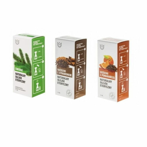 W skład zestawu wchodzą: - olejek eteryczny świerkowy 12ml - olejek eteryczny goździki z cynamonem 12ml - olejek eteryczny goździki z pomarańczą 12ml