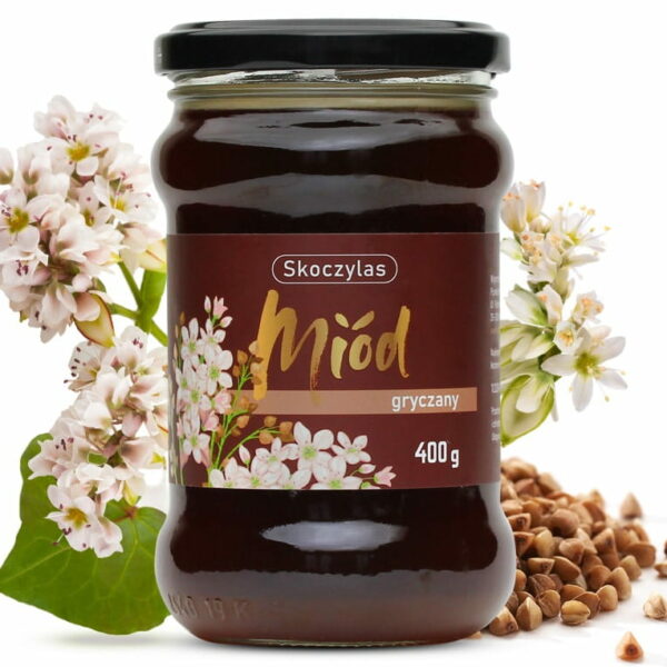 Miód gryczany 400g Miód gryczany jest miodem o wyjątkowo bogatym smaku, charakterystycznym zapachu kwiatów gryki oraz ciemnej, bursztynowej barwie. Masa: 0,4 kg Miód gryczany jest miodem o wyjątkowo bogatym smaku, charakterystycznym zapachu kwiatów gryki oraz ciemnej, bursztynowej barwie. Zawiera bardzo dużo przeciwutleniaczy mających właściwości neutralizujące wolne rodniki, łatwo przyswajalnych soli mineralnych takich jak: magnez, cynk, żelazo, fosfor, potas, mangan, miedź, rutynę, Również w miodzie tym znajdują się substancje poprawiające odporność zwane inhibinami. Miód gryczany jest bardzo dobrym zamiennikiem i można go stosować do słodzenia kawy, herbaty lub deserów. Jest również stosowany jako składnik naturalnych kosmetyków takich jak maści, maseczki czy peelingi. Korzystne działanie miodu uzyskujemy po rozpuszczeniu go w herbacie lub mleku. Trzeba jednak pamiętać, aby napoje te nie były zbyt gorące (powyżej 60ºC), ponieważ wysoka temperatura niszczy właściwości miodu.