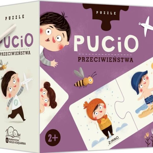 Puzzle Pucio Przeciwieństwa składają się z 20 elementów, czyli 10 par obrazków, wśród których należy znaleźć przeciwieństwa:mały i duży,stare i nowe,mokra i sucha,zdrowy i chory,smutny i wesoły,głodny i najedzony,lekkie i ciężkie,zimno i ciepło,cicho i głośno,brudny i czysty.To na pozór proste zadanie wymaga skupienia uwagi na ilustracji, ale przede wszystkim pobudza do myślenia. Mimo niedużej liczby elementów puzzle dają okazję do wielu zabaw o różnym stopniu trudności, w zależności od możliwości intelektualnych i potrzeb dziecka.