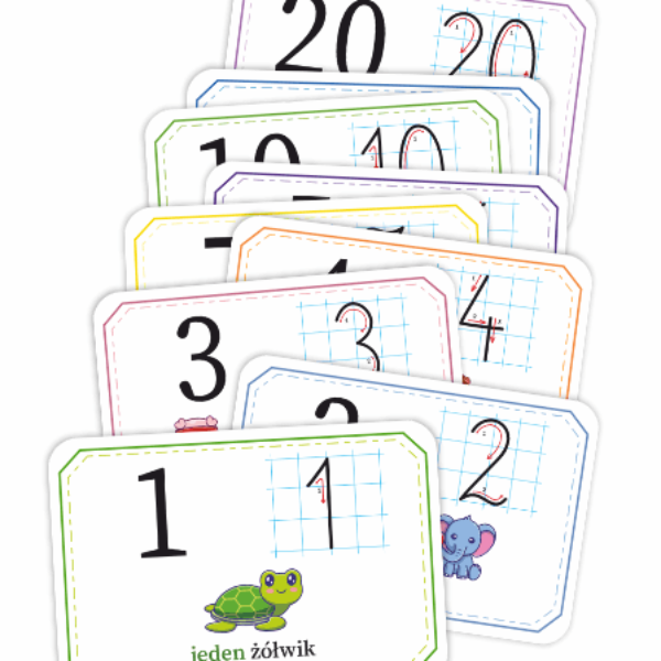Głównym zadaniem dziecka jest nauka cyferek i liczb poprzez czytanie, liczenie oraz obserwowanie. Do każdej cyferki i liczby na kartach jest przydzielony inne zwierzątko oraz jego odpowiednia ilość. Zwierzątka są w różnych pozycjach, a ich obrazki dopasowane są tak, aby jak najmniej się powtarzały. Wszystko, by urozmaicić, a także wzbogacić naukę dziecka!Zestaw zawiera cyfry od 0 do 20, razem aż 21 karty!Fiszki Cyferki:Będą niezastąpiona pomocą w nauce cyfr i liczb.Cyfry na fiszkach są zapisane stylem drukowanym oraz pisanym.Cyfry pisane posiadają instrukcję krok po kroku, jak je zapisać, dzięki czemu dziecko łatwiej przyswoi naukę pisania.Wesołe obrazki.Do kart można wymyślać własne zadania lub historyjki i połączyć naukę z przyjemnością zabawy.Fiszki są wydrukowane na papierze 300g, a także zafoliowane dwustronnie, dzięki czemu zyskują dodatkową trwałość oraz sztywność.Rogi są zaokrąglone.Rozmiar fiszek można porównać do standardowego rozmiaru kart do grania – dzięki temu są wygodne i poręczne, można zabrać je nawet na wakacje!Cechy produktu:Format: ~ (6,1 cm x 9 cm)21 kolorowych kart.Wydrukowany na sztywnym papierze 300g.Karty zafoliowane dwustronnie.Rogi zaokrąglone dla jeszcze większej trwałości.Żywe, przejrzyste kolory.