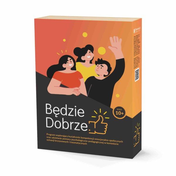 Będzie dobrze to nowoczesna pomoc psychologiczno-pedagogiczna w kontekście sytuacji kryzysowych i traumatycznych.Program Będzie dobrze to idealne wsparcie dla nauczyciela prowadzącego zajęcia o charakterze terapeutycznym lub lekcje godziny wychowawczej. Będzie dobrze to atrakcyjne i angażujące materiały przeznaczone do pracy z uczniami od dziesiątego roku życia.W skład programu wchodzi łącznie 40 nowocześnie i merytorycznie opracowanych zagadnień. Program zawiera:30 zagadnień dotyczących ważnych społecznie tematów, takich jak: dyskryminacja, autorytet, sukces, depresja, uzależnienia, fake news czy trolling,10 zagadnień związanych z zajęciami specjalistycznymi z zakresu pomocy psychologiczno-pedagogicznej, ze szczególnym uwzględnieniem zajęć wspierających kondycję psychiczną uczniów wynikającą z doświadczenia traumy, długotrwałej izolacji i innych sytuacji kryzysowych, a także tematy związane z nieporozumieniami w grupie, funkcjonowaniem grupy zróżnicowanej itp.,materiały dla nauczycieli, wychowawców i terapeutów pracujących indywidualnie lub grupowo z uczniami w wieku 10+,karty pracy i szczegółowe scenariusze zajęć uwzględniające wykorzystanie multimedialnej zawartości programu „Będzie dobrze” pozwalające dostosować sposób prowadzenia zajęć w zależności od potrzeb i możliwości klasy,interaktywne materiały aktywizujące uczniów stworzone z myślą o wspólnej pracy przy tablicy interaktywnej (np. mapa skojarzeń, metaplan, analiza SWOT, piramida priorytetów czy poker kryterialny).Jak pracować z Będzie dobrze?Każdy temat zawarty w programie „Będzie dobrze” składa się z planszy interaktywnej przedstawiającej omawiane treści w sposób stwarzający okazję do dyskusji, zasobów zawierających zadania problemowe do rozwiązania wspólnie przez całą klasę oraz tzw. lekcji uczniowskiej, którą można wykorzystać do przeprowadzenia zajęć metodą odwróconej klasy lub w formie podsumowania wiadomości po zajęciach.Dodatkowo w programie znajdują się interaktywne materiały aktywizujące uczniów stworzone z myślą o wspólnej pracy przy tablicy interaktywnej (np. mapa skojarzeń, metaplan, analiza SWOT, piramida priorytetów czy poker kryterialny).Tematy opracowane w programie Będzie dobrzeZagadnienia dotyczące ważnych społecznie tematów:DyskryminacjaNetykietaHejt i cyberprzemocTrollingFake newsEmocjeAsertywnośćDepresjaChorobyUzależnieniaAutorytetySukcesWolnośćWolność opiniiZakazy i nakazyTolerancjaIndywidualizm i kolektywizmSystem wartościRozwódStarośćReligijnośćTradycja a nowoczesnośćWspółczesny patriotyzmCzy studia to jedyna droga?Czy praca może hańbić?Kultura i wojskoPokój i wojnaZjawisko zła na świecieSeksualnośćMolestowanie seksualneTematy z zakresu pomocy psychologiczno-pedagogicznej – ze szczególnym uwzględnieniem uczniów z doświadczeniem migracji i uczniów z doświadczeniem traumy:Co zmieniła w naszym życiu pandemia?IzolacjaEmocje na skrajuSpokój i dobrostanPrawa człowieka – prawa dzieckaDobro kontra zło, czy świat jest czarno-biały?Małe rzeczy, czyli okruchy codziennościWieża babel – w poszukiwaniu wspólnego językaW drodze – doświadczenie migracjiBędzie dobrze – siła pozytywnego myśleniaZawartość programuGłówną częścią programu Będzie dobrze są interaktywne ekrany i multimedialne plansze. Jednak to nie wszystko! W pudełku użytkownicy znajdą także wiele innych pomocy ułatwiających przeprowadzenie zajęć o charakterze terapeutycznym lub lekcji godziny wychowawczej:dziewięć bezterminowych licencji dla nauczyciela i 30 licencji uczniowskich,setki angażujących ekranów interaktywnych,dwa obszerne podręczniki metodyczne,dwa zestawy autorskich kart do gier, zabaw i ćwiczeń,karty pracy i szczegółowe scenariusze zajęć.Zestaw kart Pomyśl inaczej & Słowa mają mocPomyśl inaczej to autorskie uniwersalne narzędzie, przy pomocy którego można określać nastroje, mówić o przeszłości, teraźniejszości i przyszłości, o marzeniach, wartościach i symbolach, a także zrobić trening twórczości, kreatywnego pisania, wymyślać metafory, bawić się w kalambury, kojarzyć z tytułami filmów, książek lub innych tekstów kultury.Słowa mają moc to talia kart afirmacyjnych z krótkimi inspirującymi tekstami, które można wykorzystać na wiele sposób podczas pracy z całą klasą, grupą, a także indywidualnie. Karty powiązane są z tematami lekcji omówionych w programie „Będzie dobrze”, ale stanowią także świetną pomoc dydaktyczną same w sobie!WERSJA DEMO - kliknij i przetestuj program!Dlaczego w Twojej szkole powinno znaleźć się Będzie dobrze?Program Będzie dobrze to materiały przygotowane przez pedagogów i psychologów z myślą o współczesnej młodzieży. Przejawia się to zarówno w nowoczesnej formie programu, jak i doborze tematów. W programie znajdują się ekrany dotyczące ważnych społecznie tematów pomagające młodym ludziom w ukształtowaniu ich światopoglądu oraz materiały związane z pomocą psychologiczno-pedagogiczną w kontekście doświadczeń traumy i sytuacji kryzysowych.Pr