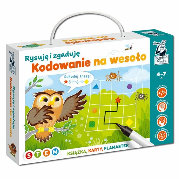 Super zabawa dla przyszłych programistów i inżynierów!Kodowanie na wesoło to aż 100 edukacyjnych zabaw (książka + karty ścieralne), które wprowadzą dziecko w podstawy matematyki, robotyki i informatyki. Mnóstwo łamigłówek i zabaw z sekwencjami, rytmami, algorytmami, a także ćwiczenia na wyznaczanie tras, pisanie kodu i odgadywanie szyfrów. Książka zawiera również wskazówki, jak rozwijać kompetencje cyfrowe u dzieci w wieku przedszkolnym i wczesnoszkolnym.Kodowanie dla dzieci i rozwijanie kompetencji cyfrowychPolecenia zostały przygotowane zgodnie z ideą STEM, dzięki czemu nauka programowania kojarzy się z ciekawym wyzwaniem. To nowe podejście polegające na rozwiązywaniu problemów metodą prób i poprawek. Integruje ono nauki ścisłe, nowoczesne technologie, inżynierię oraz matematykę, by efektywniej myśleć oraz znajdować nowe pomysły. Nauka kodowania w zabawieKodowanie na wesoło to świetna przygoda wprowadzająca przedszkolaki i uczniów klas pierwszych w podstawy programowania. Zawiera mnóstwo łamigłówek, m.in. zabawy z rytmami, sekwencjami i algorytmami, ćwiczenia na kratownicy przygotowujące do pracy z matą do kodowania, a także ćwiczenia na wyznaczanie tras, pisanie kodu i odgadywanie szyfrów. Dla najmłodszych przygotowano zadania na obrazkach, które są bliskie ich zainteresowaniom. Łamigłówki dla starszych dzieci wykorzystują kody na literach, liczbach i symbolach, aby rozwijać myślenie abstrakcyjne, poszerzać zasób słownictwa oraz utrwalać umiejętności matematyczne.Pakiet zawiera ponad 100 wciągających zadań (książka + 30 dwustronnych kart ścieralnych) kształtujących myślenie, orientację przestrzenną, uwagę oraz percepcję wzrokową. Zadania zostały tak przygotowane, aby nauka programowania kojarzyła się z ciekawym wyzwaniem – zgodnie z ideą STEM. Dzięki flamastrowi suchościeralnemu dołączonemu do zestawu łamigłówki można rozwiązywać wielokrotnie, a dzięki temu testować swoje pomysły i rozwijać umiejętności.Rozwój:kodowanie,myślenie logiczne,kreatywność,grafopercepcjaZestaw został wyprodukowany w Polsce z troską o bezpieczeństwo najmłodszych.