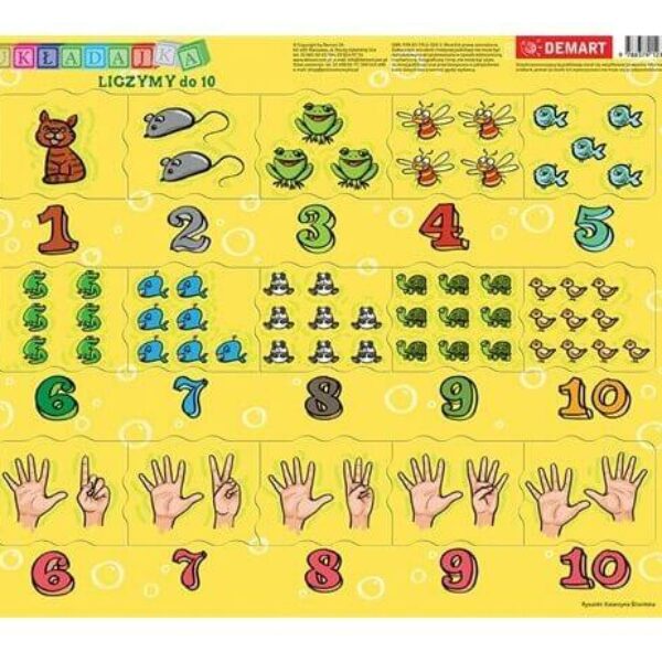 Puzzle z 15 ruchomymi elementami o indywidualnym, niepowtarzalnym kształcie wykrojonymi w odpowiednich miejscach obrazka. Poznawanie liczb do 10 dla najmłodszych dzieci.Podczas układania puzzli dziecko ćwiczy:logiczne myślenie i koncentrację,spostrzegawczość,precyzję ruchów. Puzzle nauka liczeniaDziecko ma odnaleźć i dopasować 15 wyjmowanych elementów tworzących logiczną całość z podpisanymi liczbami od 1 do 10.Na wyjmowanych elementach narysowane są różne zwierzęta ilustrujące liczby od 1 do 10 albo pokazane są dłonie z wyprostowanymi palcami w liczbie od 6 do 10.Podwójne zilustrowanie liczb 6-10 ma na celu uzmysłowienie dziecku ich wartości i znaczenia porządkowego (pięć palców to mniej niż sześć, a dziesięć to więcej niż 8 i 9, co łatwo sprawdzić na własnych dłoniach). Ćwiczenia w tym zakresie od 1 do 5 dziecko może spróbować wykonać samo.Ułatwieniem w dopasowaniu zwierząt do liczb jest kolorystyka. Każda podpisana liczba i zwierzęta mają ten sam kolor przewodni (np. 4 – czerwony a 7 – niebieski). Zresztą, każdy wyjmowany element ma niepowtarzalny kształt, który trzeba umiejętnie i precyzyjnie umieścić.Przy dopasowywaniu elementów z rysunkiem dłoni dziecko powinno zwracać uwagę na liczbę wyprostowanych palców, co wymaga skupienia i koncentracji. Musi opracować swoją strategię w zapełnianiu puzzlowego obrazka.Podczas zabawy można popuścić wodze fantazji i odciągnąć dziecko od zabawy z telefonem czy tabletem!Puzzle dla najmłodszych dzieci (4–6 lat).