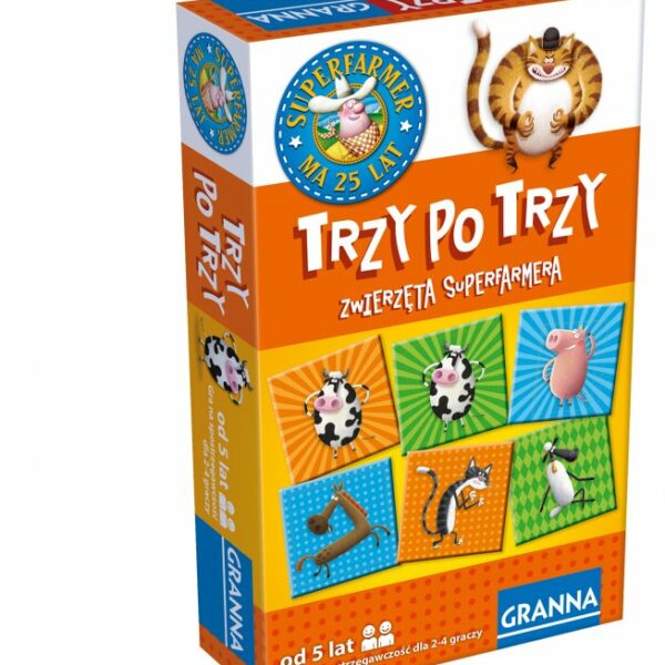 Znana i lubiana w Polsce gra „Trzy po trzy” teraz w nowej, Superfarmerowej szacie graficznej. Szybka i zabawna gra logiczna, która ćwiczy spostrzegawczość. Gra imprezowa dla całej rodziny!Gra specjalnie wydana, z okazji jubileuszu Superfarmera. Niesforne zwierzaki lubią bawić się w chowanego. Czy uda Ci się złapać 5 z nich? Przyglądaj się uważnie kartom, szukaj odpowiednich wzorów i kolorów oraz twórz układy, które przyniosą Ci wygraną.Zawartość pudełka:81 kart zwierzaków9 kart startowych18 żetonów punktówinstrukcjaCzas gry ok. 30 minLiczba graczy: 2-4Wiek: 5+