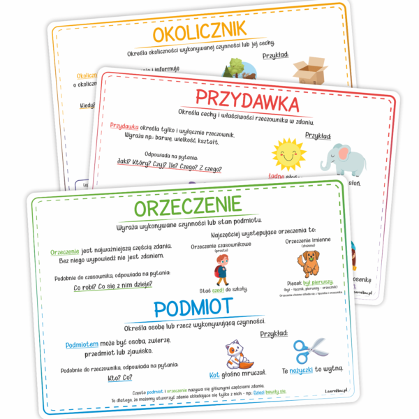 Plansze edukacyjne. Części zdania (3 kolorowe plansze A4)