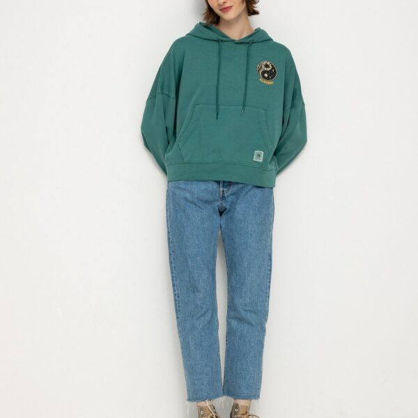 Materiał: 60% bawełna, 40% poliester • Dwuwarstwowy, regulowany kaptur • Rękawy oraz dół wykończone wygodnym ściągaczem • Kieszeń typu kangur • Grafika na piersi i plecach