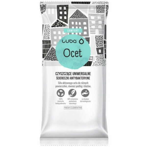 Luba Ściereczki Antybakteryjne Uniwersalne Ocet 24 SztukiŚciereczki uniwersalne do czyszczenia kuchni. Poznaj siłę czyszczącą octu owocowego i sody! Te dwa naturalne składniki świetnie radzą sobie z kuchennymi zabrudzeniami, trudnymi do usunięcia plamami z tłuszczu i zaschniętymi kółkami po kawie, czy herbacie. 1 ściereczka wystarczy do wyczyszczenia dużej powierzchni, ponadto ściereczki LUBA są wyjątkowo chłonne. W błyskawicznym tempie poradzą sobie z każdym rodzajem kuchennych zanieczyszczeń. Chusteczki nawilżane są przebadane dermatologicznie i nie uszkadzają skóry dłoni. Czyszczone powierzchnie nie tylko lśnią czystością, ale doskonale pachną cytrusami, a zapach ten jest długotrwały, co daje uczucie czystości i świeżości na kilka dni.Co wyróżnia nasz produkt na tle innych, dostępnych na rynku?Materiały pochodzenia naturalnego - włóknina wiskozowa jest w 100 % biodegradowalna i kompostowalnaNaturalne składniki czyszczące - to aż 96% składników naturalnychPrzebadane dermatologicznie - ściereczki są przyjazne dla skóry dłoniRecyklingowalne opakowanie - po zużyciu produktu, opakowanie należy wrzucić do odpowiedniego pojemnika na odpady z tworzyw sztucznychLUBA Comfort Czyszczące Uniwersalne Ściereczki Antybakteryjne - Ocet:Składniki formuły pochodzenia naturalnegoRoślinna, biodegradowalna włókninaDziałanie antybakteryjneSzybkie i komfortowe sprzątanie powierzchniPozostawiają połysk bez smugPrzebadane dermatologiczniePozostawiają subtelny zapach czystościUniwersalnośćDo czego przeznaczony jest produkt?Odkażanie różnych domowych powierzchniSzyby, lustra, szklane powierzchniePodłogi i blatyCzego nie należy kategorycznie czyścić ściereczką z octem?Blatów, zlewów i podłóg z naturalnego kamienia (marmur, granit)Podłóg z woskowanego drewnaJak używać produktu?Otwórz opakowanie w miejscu wyznaczonym strzałką.Wyjmij 1 ściereczkę czyszczącą.Dokładnie zamknij opakowanie chusteczek czyszczących, żeby reszta nie wyschła i zachowała swoje właściwości.Wyczyść wybrane powierzchnie.Dla lepszego efektu wypoleruj do sucha.Zużytą ściereczkę wyrzuć do kosza. W razie kontaktu z oczami przemyj je dokładnie wodą.Po wykorzystaniu wszystkich dostępnych ściereczek wyrzuć opakowanie do odpowiedniego pojemnika na odpady recyklingowane.