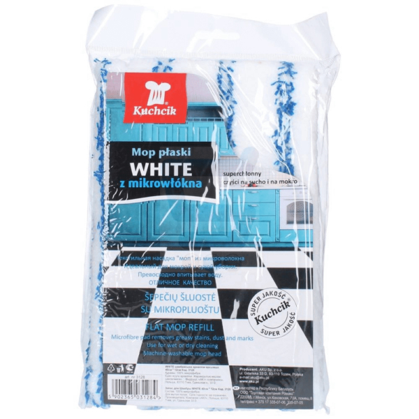 Kuchcik Mop Płaski Z Mikrofibry ZapasMopy Kuchcik to wysokiej jakości produkty przeznaczone zarówno do użytku domowego jak i w gastronomii. Mop płaski super chłonny z mikrofibry. Mop wykonany jest z grubych frędzli mikrofibry, dzięki czemu chłonie trzykrotnie więcej brudu i wody niż mop z bawełny. Skutecznie usuwa brud z każdego rodzaju podłogi. Można go stosować na sucho i na mokro.do stosowania na sucho i mokro,z mikrowłókna,nie wymaga detergentów,superchłonnygrubość 1,5 cmszerokość 13,8 cm (-/+ 5%)długość 44 cm (-/+ 5%)waga 50g (-/+ 5%)