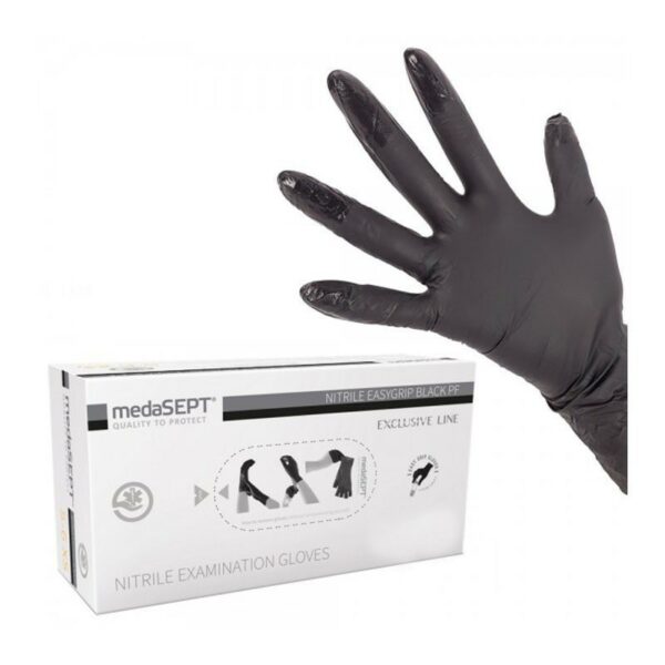 medaSEPT Rękawice Nitrylowe Bezpudrowe Czarne L 100 SztukRękawiczki nitrylowe są alternatywą dla wszystkich rękawiczek wykonanych z lateksu. Rękawiczki medyczne, które nie wywołują uczuleń, są obojętne dla ludzkiej skóry (nie wywołują niepożądanych reakcji).Nie wykazują właściwości alergizujących – co przekłada się na komfort pracy.Rękawiczki posiadają dobre właściwości mechaniczne substancji, z których zostały wykonane.Rękawiczki posiadają uniwersalny kształt - pasują na prawą i na lewą dłoń.Wykończenie mankietu – rolowany brzeg.Doskonała ochrona przed wirusami oraz krwiopochodnymi patogenami.Środek pudrujący – brak.