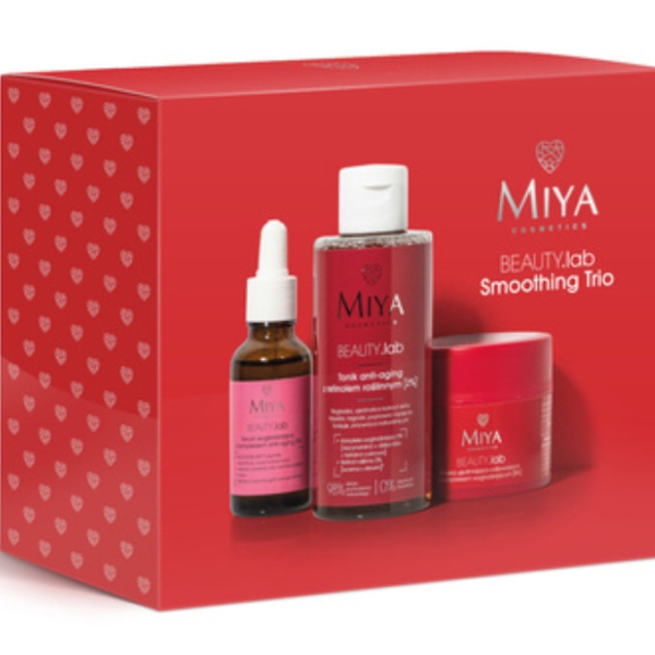 Miya Cosmetics beauty.LAB Smoothing Trio Zestaw (tonik anti-aging z retinolem roślinnym 2% do twarzy, 150 ml + serum wygładzające z kompleksem anti-aging 5%, 30 ml + maska ujędrniająco-odżywiająca z kompleksem wygładzającym 8% 50 ml).BEAUTY.lab to specjalistyczna seria kosmetyków naturalnych: wyższe stężenia składników aktywnych o ukierunkowanym działaniu + moc natury. W zestawie znajdziesz trzy bestsellery BEAUTY.lab, które uzupełnią codzienną pielęgnację wygłądzającą i ujędrniającą Twoją skórę. Smoothing Trio i #JestemGotowa BEAUTY.lab Tonik z retinolem roślinnym [2%]* 150 ml Tonizuje, nawilża skórę, poprawia jej napięcie. Nałóż na oczyszczoną skórę twarzy, stosuj rano i wieczorem.98% składu pochodzenia naturalnego, 0% zbędnych dodatków.Kompleks wygładzający 5% [niacynamid + dzika róża + betaina cukrowa]: nawilża, wygładza, łagodzi, poprawia kondycję i koloryt skóry.Retinol roślinny 2% [lucerna + stewia]*: wygładza, zmniejsza widoczność drobnych linii, poprawia napięcie i wygląd skóry, dodaje jej sprężystości.BEAUTY.lab Serum wygładzające z kompleksem anti-aging 5%, 30 ml Wygładza, redukuje zmarszczki, ujędrnia, nawilża i regeneruje. Działa jak naturalny botoks. Wmasuj kilka kropli w skórę twarzy, okolice oczu i szyję. Stosuj rano i wieczorem. 98,4% składu pochodzenia naturalnego, 0% zbędnych dodatków.ARGIRELINE™ peptide: neuropeptyd, nazywany alternatywą dla botoksu, rozluźnia, redukuje zmarszczki, ujędrnia.Kwas fitowy: działa przeciwstarzeniowo.Kwas hialuronowy: wielostopniowo nawilża.Inulina: naturalny prebiotyk, poprawia kondycję skóry.Hydrolat z kwiatów róży damasceńskiej, ekstrakty z czarnej borówki, owoców goji: naturalnie wzmacniają, rozświetlają, wygładzają, nadają blasku.BEAUTY.lab Maska ujędrniająco-odżywiająca z kompleksem wygładzającym [8%], 50 ml Specjalistyczna pielęgnacja ujędrniająco-odżywiająca. Już po jednym użyciu dodaje skórze sprężystości, napina ją, skóra staje miękka i gładka w dotyku. Stosowana regularnie uelastycznia skórę, ujędrnia i odżywia, zmniejsza widoczność linii i zmarszczek. Stosuj 2-3 razy w tygodniu. 95% składu pochodzenia naturalnego, 0% zbędnych dodatków.Kompleks wygładzający [ekstrakt z figi + ekstrakt z kwiatu migdałowca + Aquaxyl™+ niacynamid + gliceryna roślinna]: odżywia, ujędrnia, intensywnie nawilża skórę, regeneruje, wygładza, dodaje jej miękkości, przywraca elastycznośPeptydy: przywracają skórze młody wygląd, uelastyczniająWitamina E: dodaje elastyczności, nawilża Przebadane dermatologicznie.Odpowiednie do każdego typu skóry, także wrażliwej. Wegańskie.*ekstrakty z lucerny i stewii jako roślinne odpowiedniki retinolu.