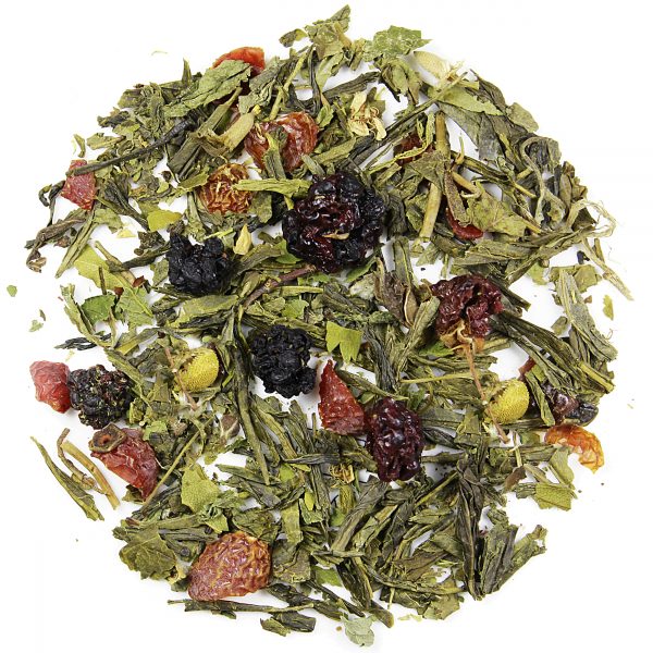 Happiness tea to mieszanka która cieszy zmysły i odpręża umysł. Oparta na zielonej Senchy kompozycja kryje w sobie liście uspokajającej i kojącej nerwy melisy, a także całą gamę dodatków smakowych. Wśród nich odnaleźć można m.in. płatki róży, owoce jeżyny czy kwiat rumianku. Gotowy napar nabiera bardzo jasnej, słomkowej barwy i przyjemnego, herbaciano-rumiankowego aromatu. W jego smaku wyczuwalne są przede wszystkim nuty jeżynowe okraszone różanymi akcentami, choć te dodatki nie są w stanie zdominować wyrazistego smaku orzeźwiającej Senchy. Herbatę Happiness najprzyjemniej pić w chłodne jesienne wieczory i popołudnia. Jej smak i aromat z łatwością przypominają o wiosennych i letnich dniach i błyskawicznie poprawiają samopoczucie.