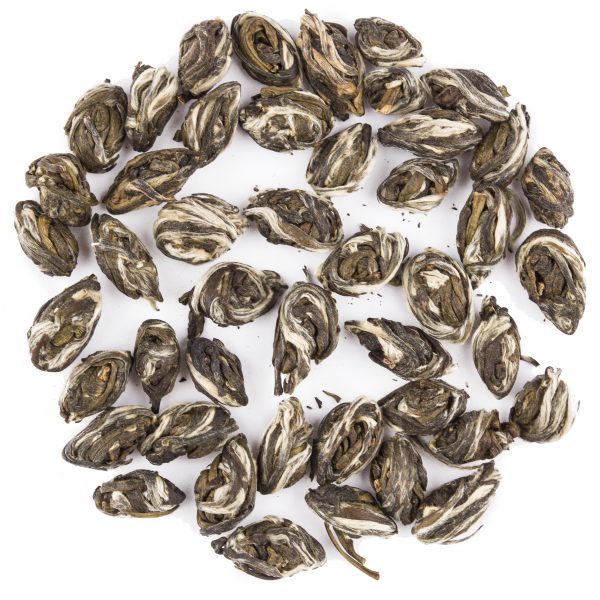 Ta wyśmienita biała herbata swoją unikatową jakość i niepowtarzalny, jaśminowy aromat zawdzięcza pieczołowitemu i długotrwałemu procesowi wytwarzania. Najmłodsze, pokryte srebrnym puszkiem listki herbacianego krzewu tuż po zerwaniu poddawane są wstępnemu suszeniu a następnie przypiekane w specjalnych rondlach, tak aby nie dopuścić do ich fermentacji. Ostatecznie wysuszona, leżakuje kilka miesięcy czekając, aż do życia obudzą się kwiaty jaśminu. Urzekające zapachem płatki kwiatów przez kilkanaście dni oddają swój aromat herbacianym listkom, po czym są od nich oddzielane. Po zaparzeniu, otrzymujemy napar o złotawym odcieniu i szlachetnym smaku najdoskonalszej białej herbaty.Jade Eyes zawdzięcza swa nazwę charakterystycznemu wyglądowi. Listki tuż przed ususzeniem zwijane są ręcznie w owalne kuleczki przypominające kształtem zielonkawe oczy orientalnych piękności.