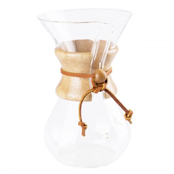 Chemex Coffee Maker został wynaleziony w 1941 roku przez doktora Petera Schlumbohm. Projekt urządzenia powstał na podstawie doświadczeń zdobytych przez tego utalentowanego chemika. Jednoczęściowe naczynie w kształcie klepsydry wykonane jest z wysokiej jakości żaroodpornego szkła. Rolę uchwytu pełni oplatający je drewniany kołnierz z rzemieniem. Szkło, z którego zrobiony jest Chemex nie absorbuje zapachów, a co za tym idzie w żaden sposób nie wpływa na walory smakowe zaparzanej kawy. Oprócz funkcjonalności, Chemex wyróżnia się niesamowitym wyglądem. Przygotowanie kawy jest bardzo proste i zajmuje około 5 minut. Wystarczy włożyć filtr, wsypać ulubioną kawę i zalać gorącą wodą. Z tym modelem można przygotować do 6 filiżanek kawy.
