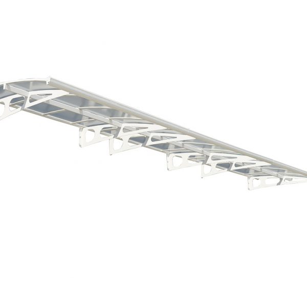 Elegant, impressive and strong, the Bordeaux Door Awning will keep your entrance, door, and facade dry and protected from the harsh elements; cover your entryway, BBQ grill, and bicycle from snow / hail and reduce the amount of direct sunlight. The powder coated, galvanized steel support arms, aluminum front and back trims, and the high impact 100% UV absorbent solid panel which is immune to the harmful UV rays, make the Bordeaux 2230 the perfect Awning. Its robust and modern design matches any home decor. The Bordeaux’s front gutter and hidden rubber gasket helps direct rain and snow off to the sides, keeping your entrance clear. This Do-It-Yourself product is made to ensure durability for many years of use, add value to your home or property and create an eco-friendly extension; includes all installation hardware.Roofing panel• High impact, 3 mm clear solid panels, naturally immune to the harmful UV rays• Smart and fast locking assembly system – secure DIY installation• Ready to assemble pre-cut panel• No need to drill through the solid panelsFrame Material• Rust-resistant, aluminum frame• Durable, Laser cut, white powder coated & Galvanized Steel support arms (RAL 9016)• Ready to assemble pre-drilled profilesGutter and Gasket• Front Aluminum gutter directs rainwater sideways• Back hidden rubber gasket seals canopy to the wall surface & prevents water seepageMounting• Mounting hardware included