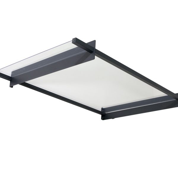Define the entrance to your home with this elegant, clean designed canopy while protecting your door and windows from the harsh elements. The Nancy 1500’s high impact solid panel gives you plenty of light while keeping your entrance clear; the rust resistant, powder coated aluminum support arms provide complementary elegance. Add value to your home or property and create an Eco-friendly extension with this Do-It-Yourself product; includes all installation hardware and is made to ensure durability for many years of use.Roofing panel• High impact, clear 4 mm solid panel, naturally immune to the harmful UV rays• Easy DIY assembly – no special tools required• Ready to assemble pre-cut panelFrame Material• Durable, powder coated galvanized steel support brackets in dark grey finish• Ready to assemble pre-drilled profilesGutter• Front Aluminum gutter directs rainwater sidewaysGasket• Back hidden rubber gasket seals canopy to the wall surface & prevents water seepageMounting• Mounting hardware included