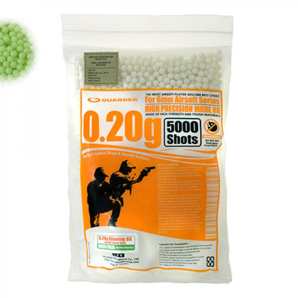 Precyzyjne kulki o wadze 0,20 g,świecące w ciemności, przeznaczone do AEG-ów oraz pistoletów gazowych. Po ich naświetleniu można śledzić ich tor lotu nawet całkowitych ciemnościach.Kulki GUARDER są bezkonkurencyjne pod względem jakości wykonania, uważane są za jedne z najlepszych na świecie. Można je stosować bez problemu w lufach precyzyjnych (zero zacięć!).Worek zawiera 5000 kulek.